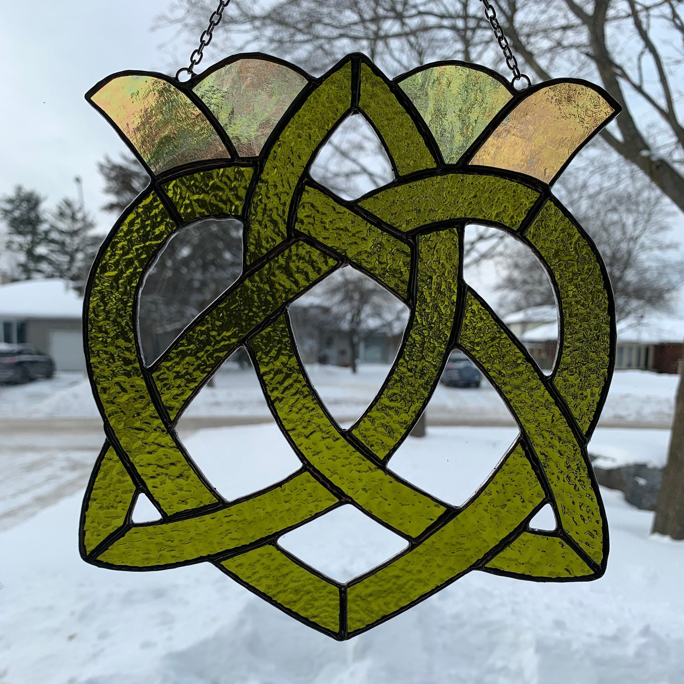 Stained Glass Celtic Heart and Crown in Textured Moss Green and Iridescent Gold.